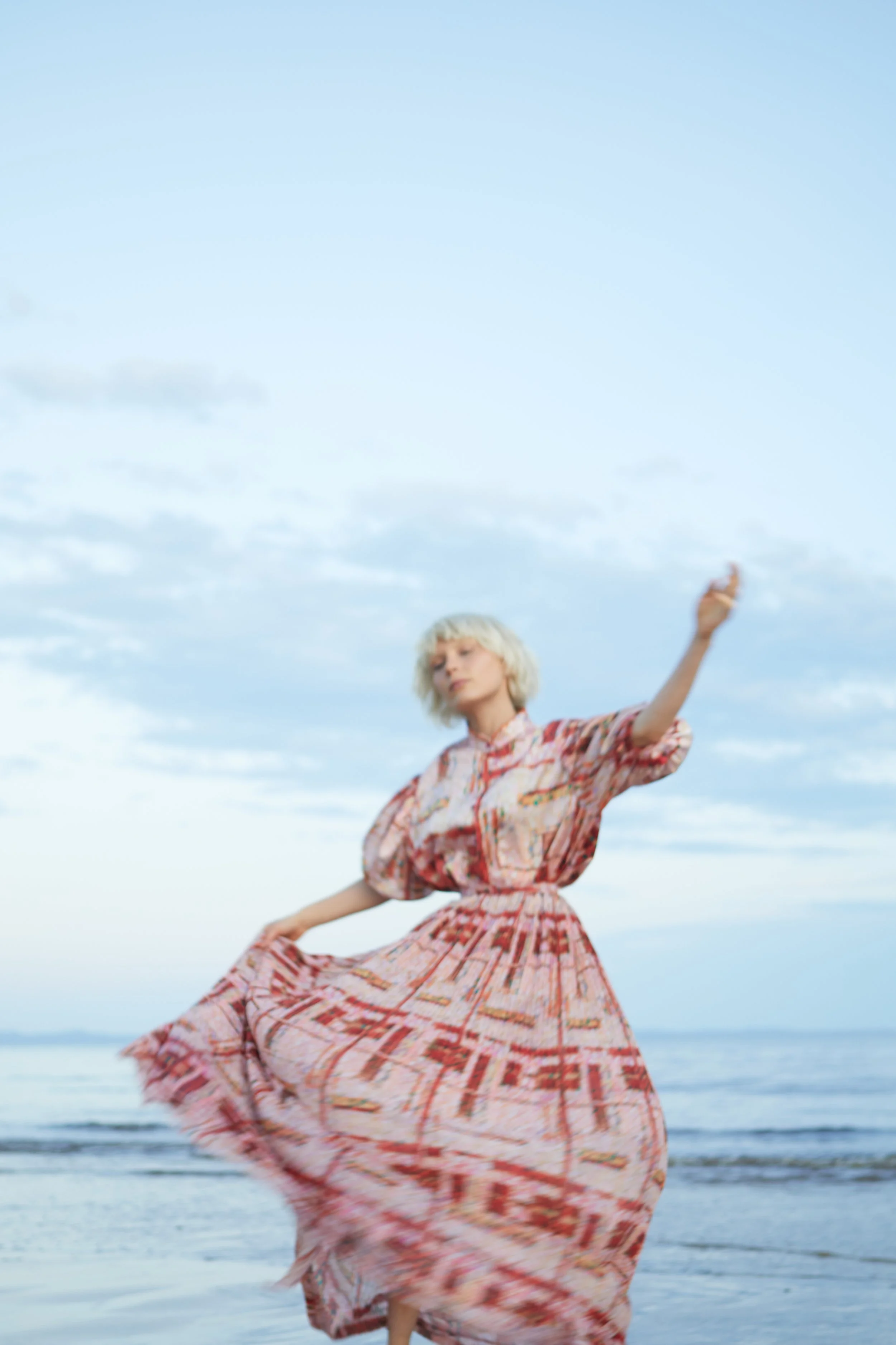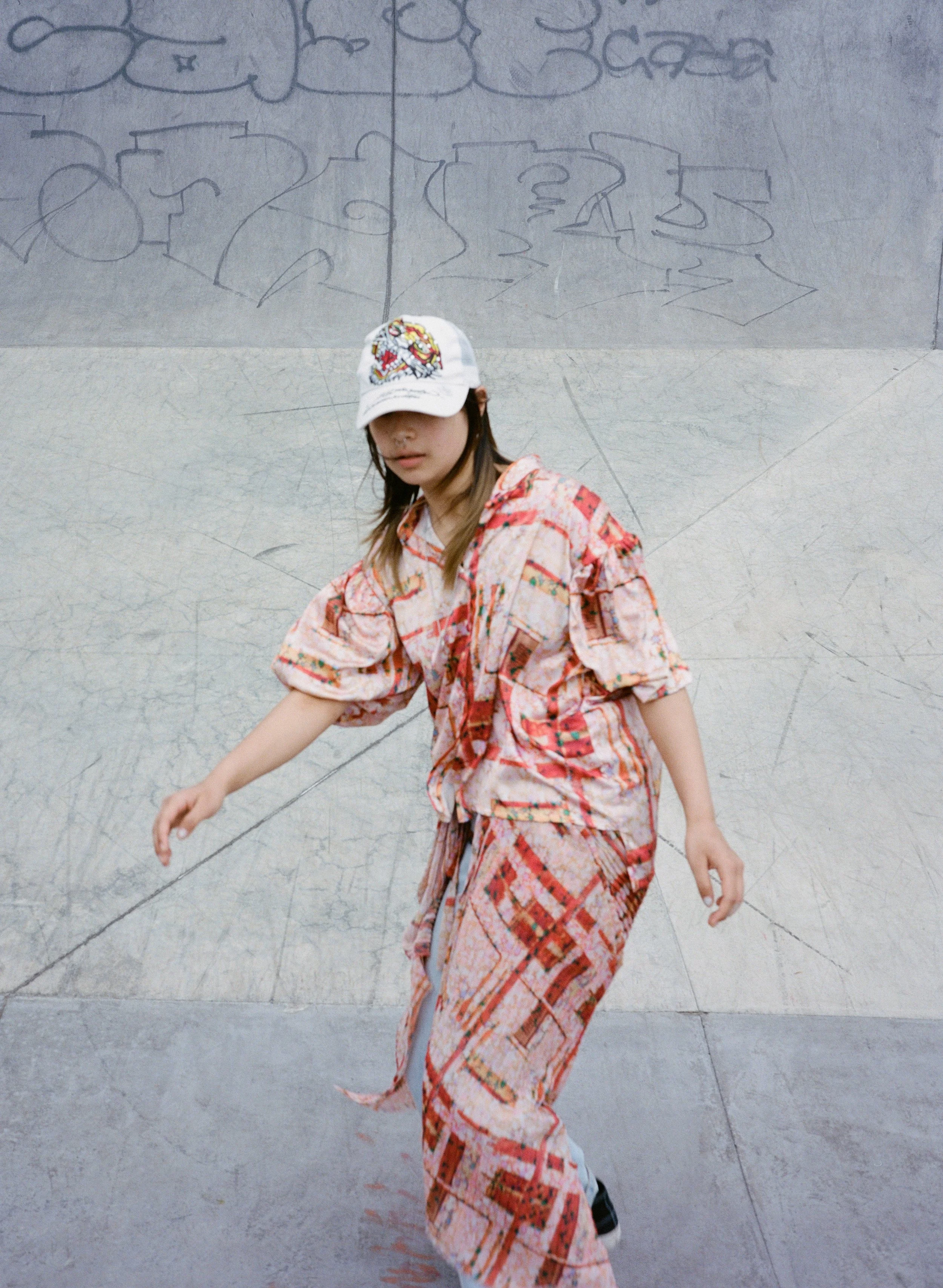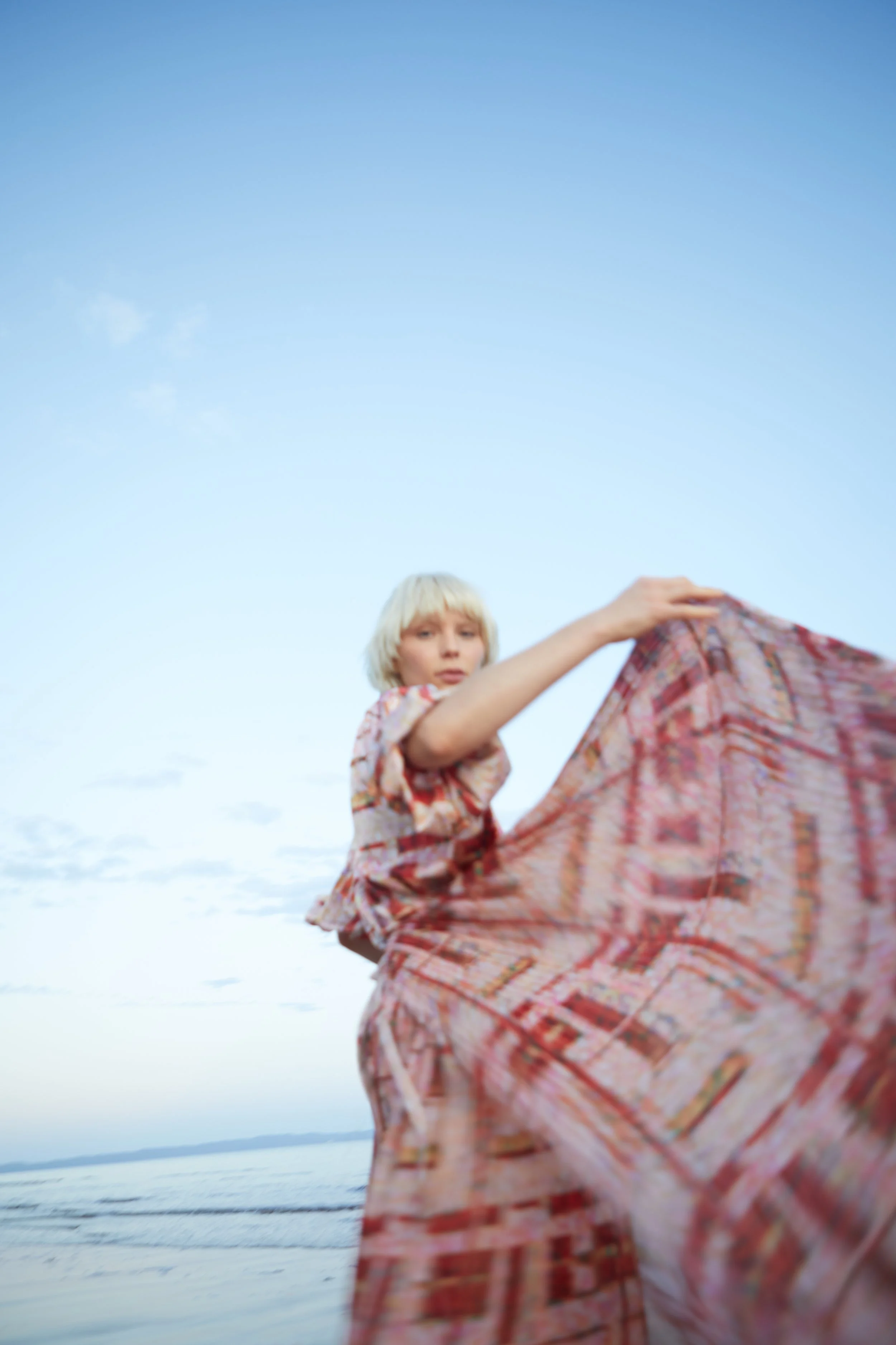 Hug In The Maze fashion editorial featured in Vogue Italia online. Bella Mccann wears Karis Zanetta Lhasa pleated skirt and Kawi pant.